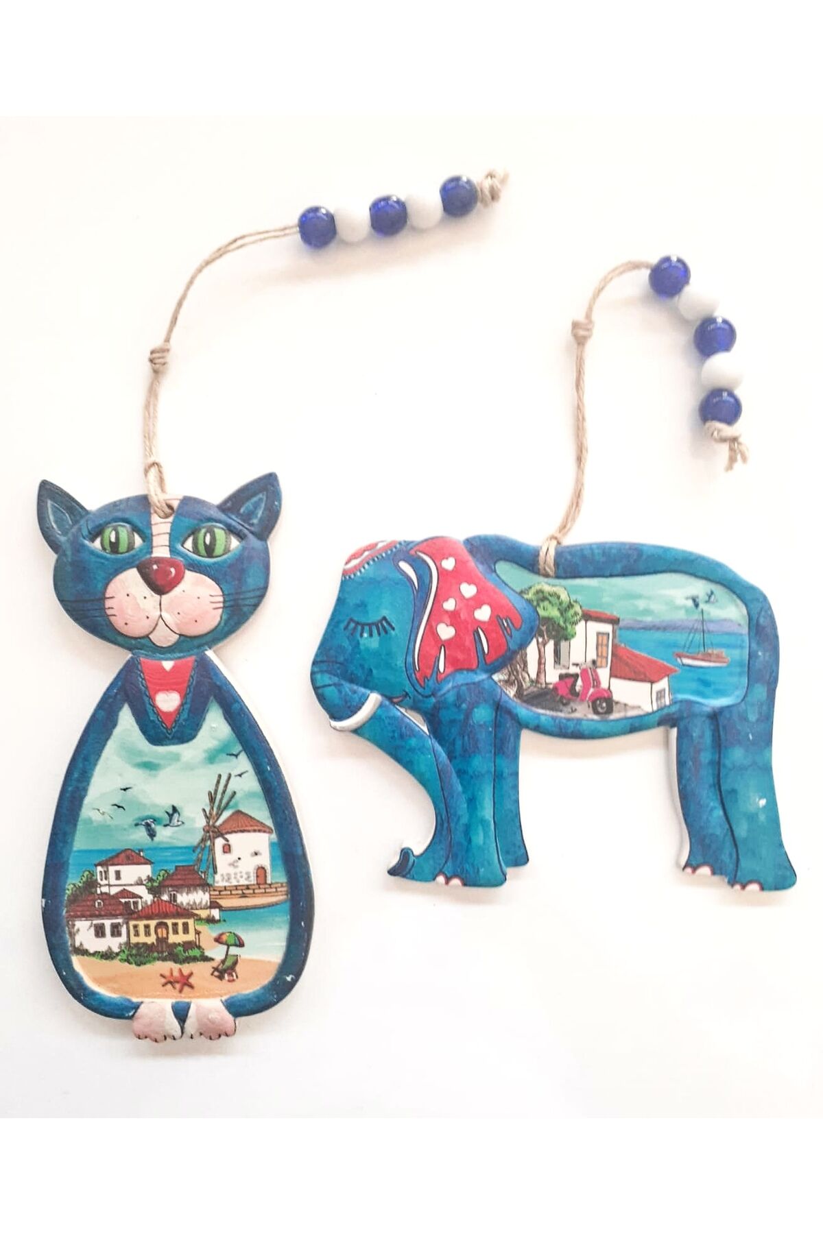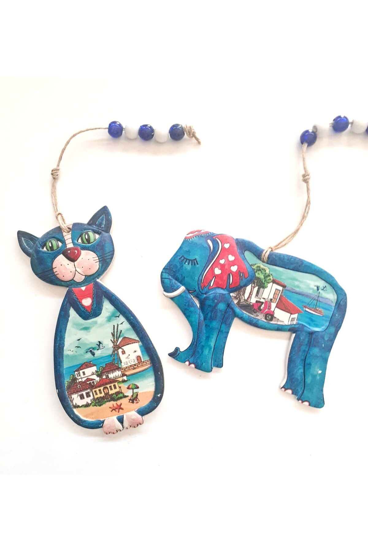 2'Li Kedi Ve Fil Figürlü Nazar Boncuklu Jüt İpli Teras Bahçe Balkon Yazlık Duvar Dekorasyon Süsü