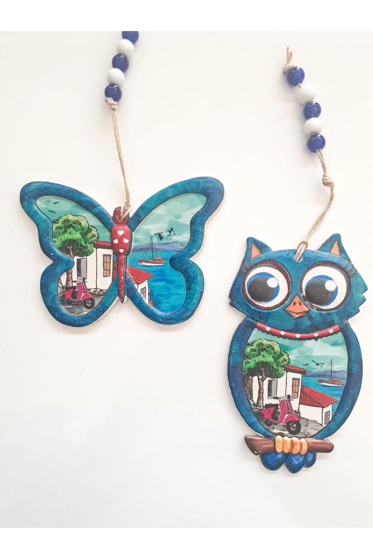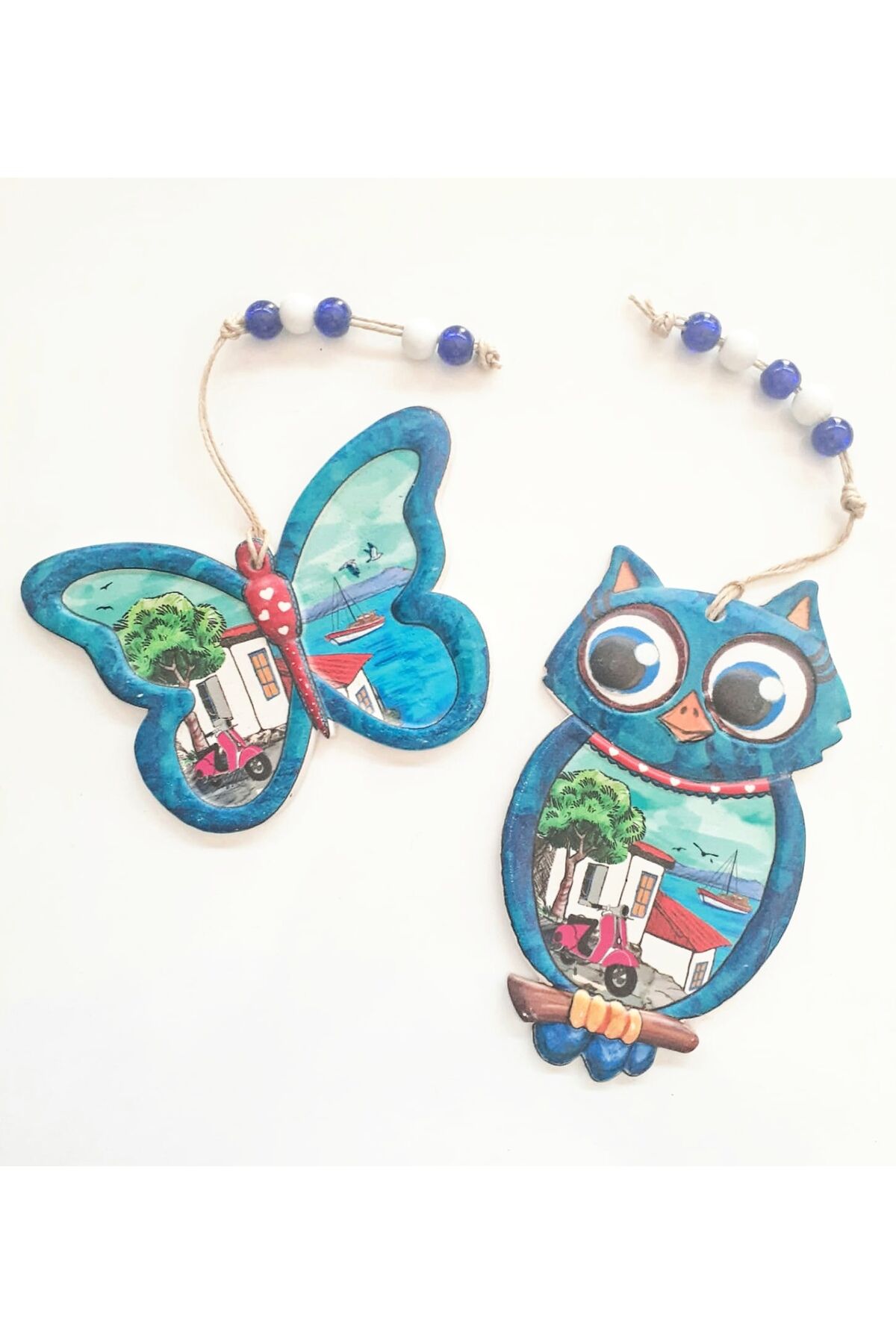 2'Li Kelebek Ve Baykuş Figür Nazar Boncuklu Jüt İpli Teras Bahçe Balkon Yazlık Duvar Dekorasyon Süsü