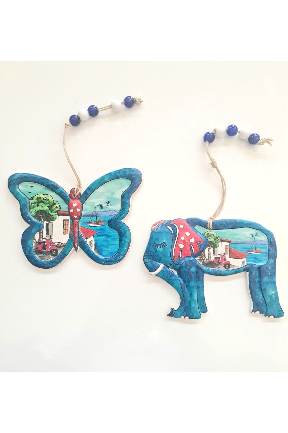 2'Li Kelebek Ve Fil Figürlü Nazar Boncuklu Jüt İpli Teras Bahçe Balkon Yazlık Duvar Dekorasyon Süsü