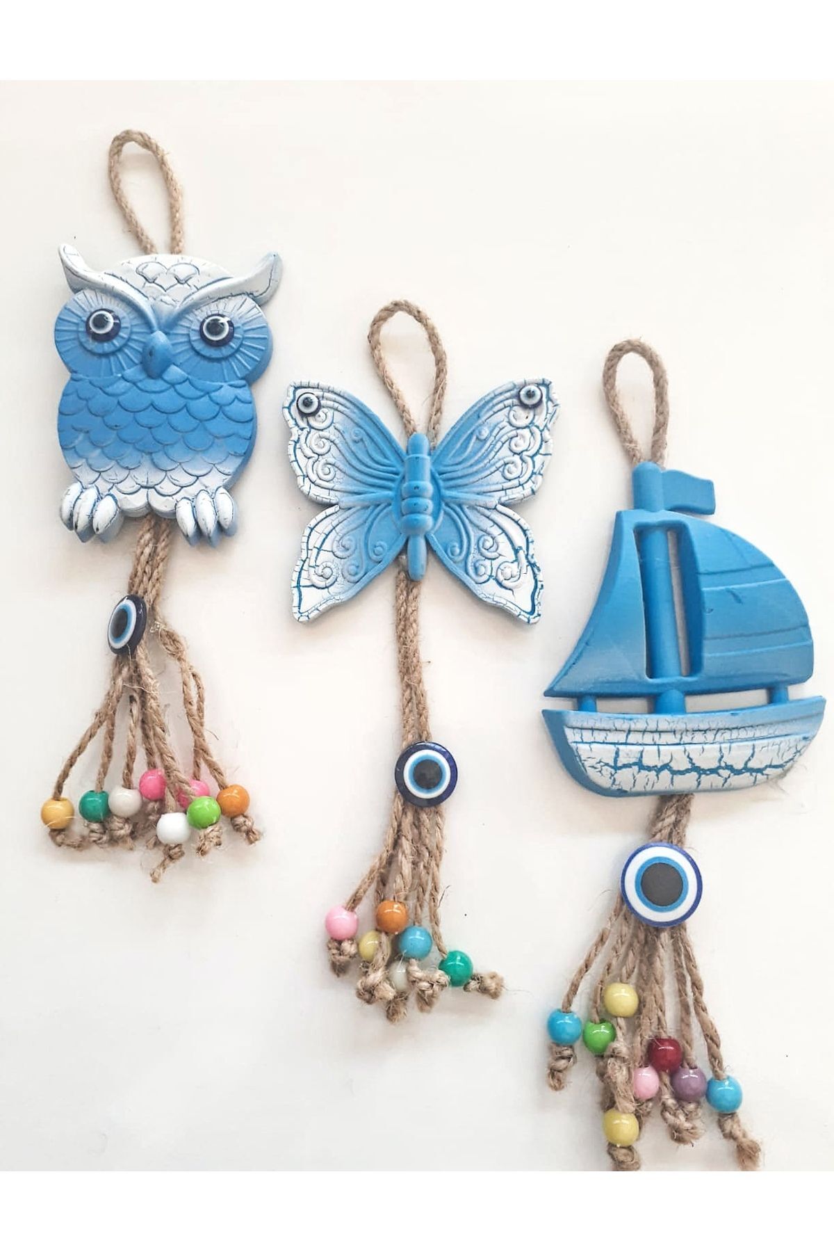 3'Lü Baykuş Kelebek Yelken Figürlü Nazar Boncuklu Jüt İpli Teras Bahçe Balkon Yazlık Duvar Süsü Seti