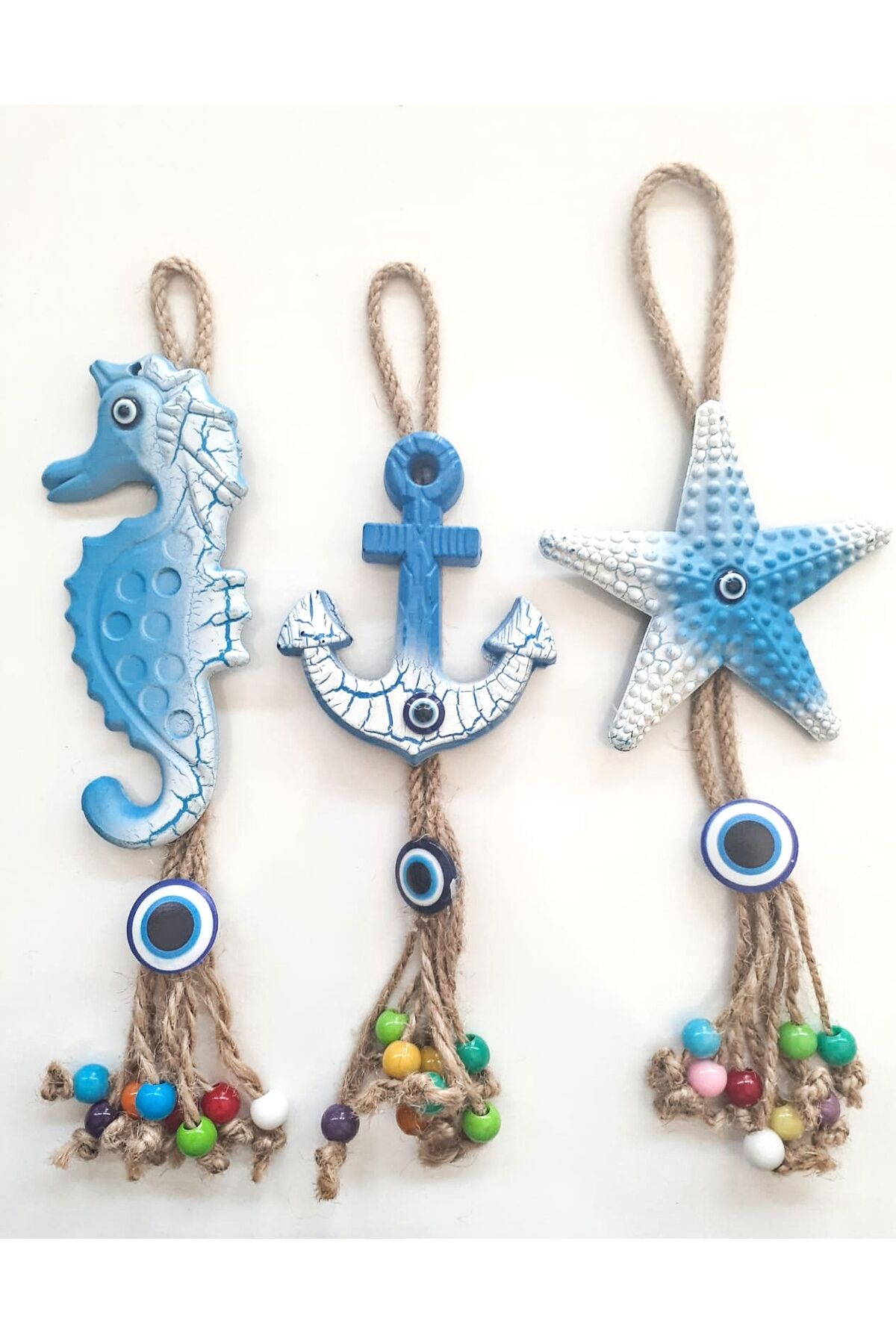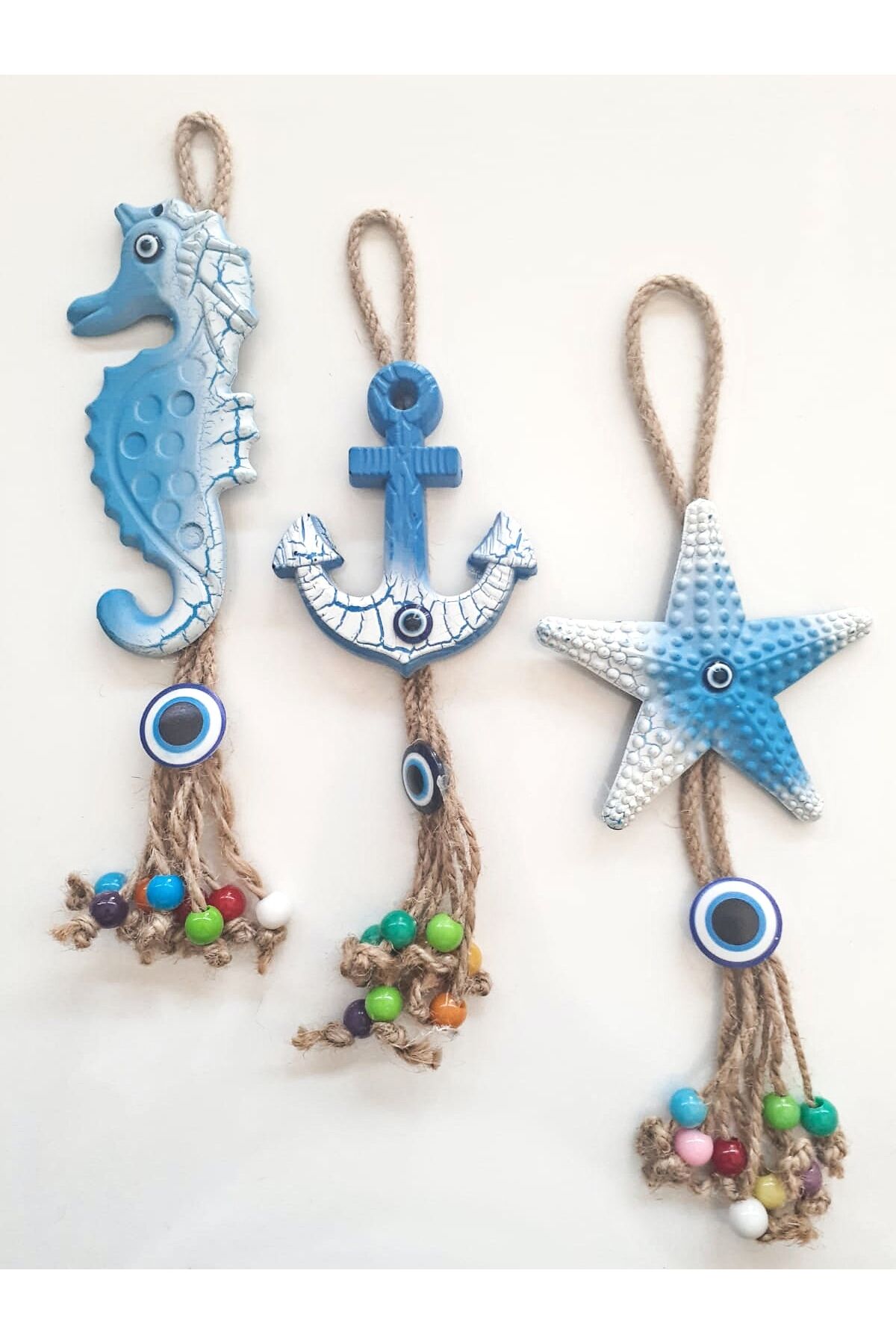 3'Lü Deniz Atı Çapa Deniz Yıldızı Nazar Boncuklu Jüt İpli Teras Bahçe Balkon Yazlık Duvar Süsü Seti