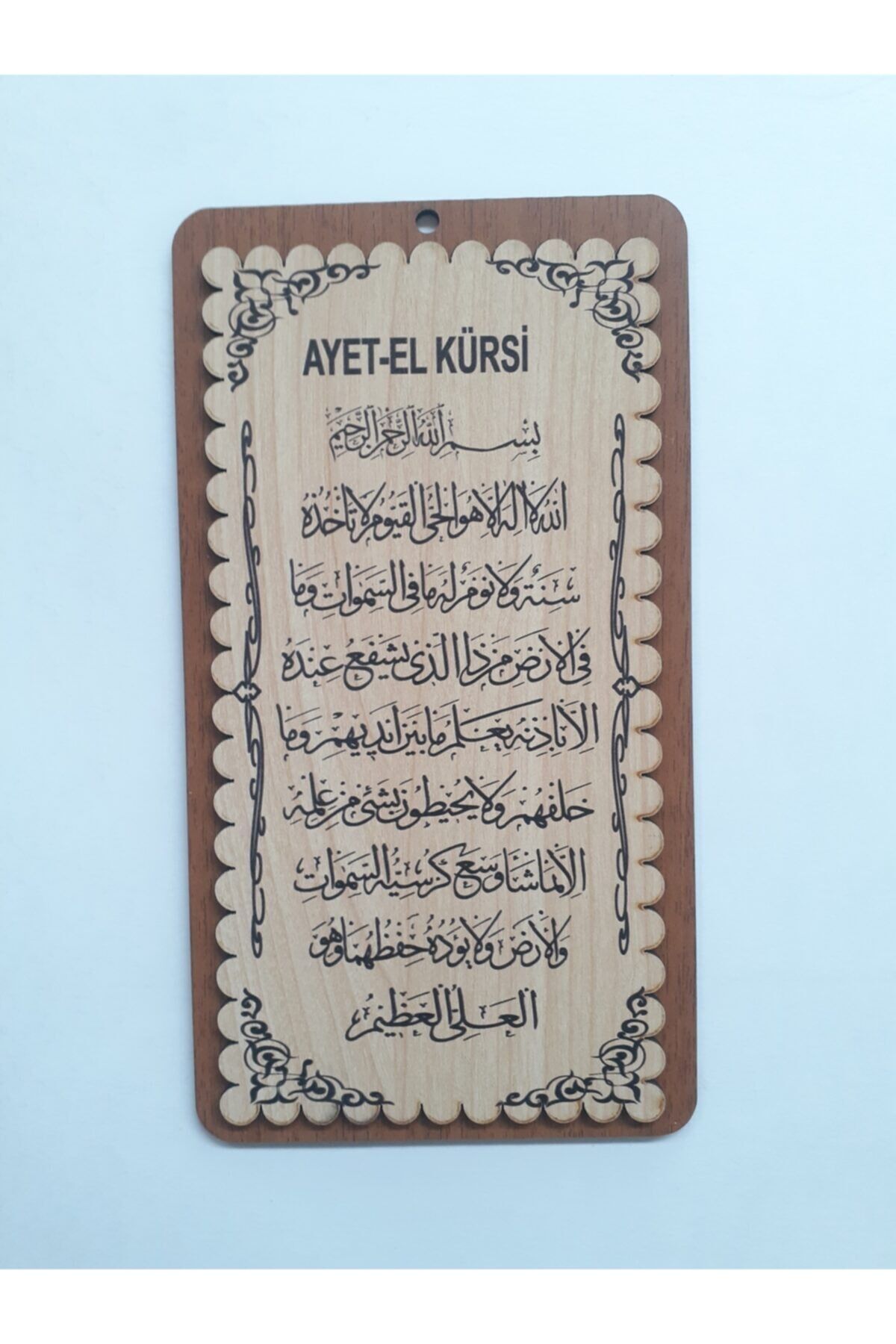 - Ahşap malzeme kullanımı sayesinde doğal ve sıcak bir görünüm sunar, mekanınıza otantik bir dokunuş katar; - Ayetel kürsi yazılı tasarımıyla manevi değerleri evinizin duvarlarına taşır, dini dekorasyonunuzu zenginleştirir; - Ahşap tablo, dayanıklılığı ve uzun ömürlü kullanımı ile yıllar boyu estetik bir görünüm sağlar; - Duvar süsü olarak tercih edebileceğiniz bu ürün, evinizin her köşesine kolayca uyum sağlayarak şık bir atmosfer yaratır;