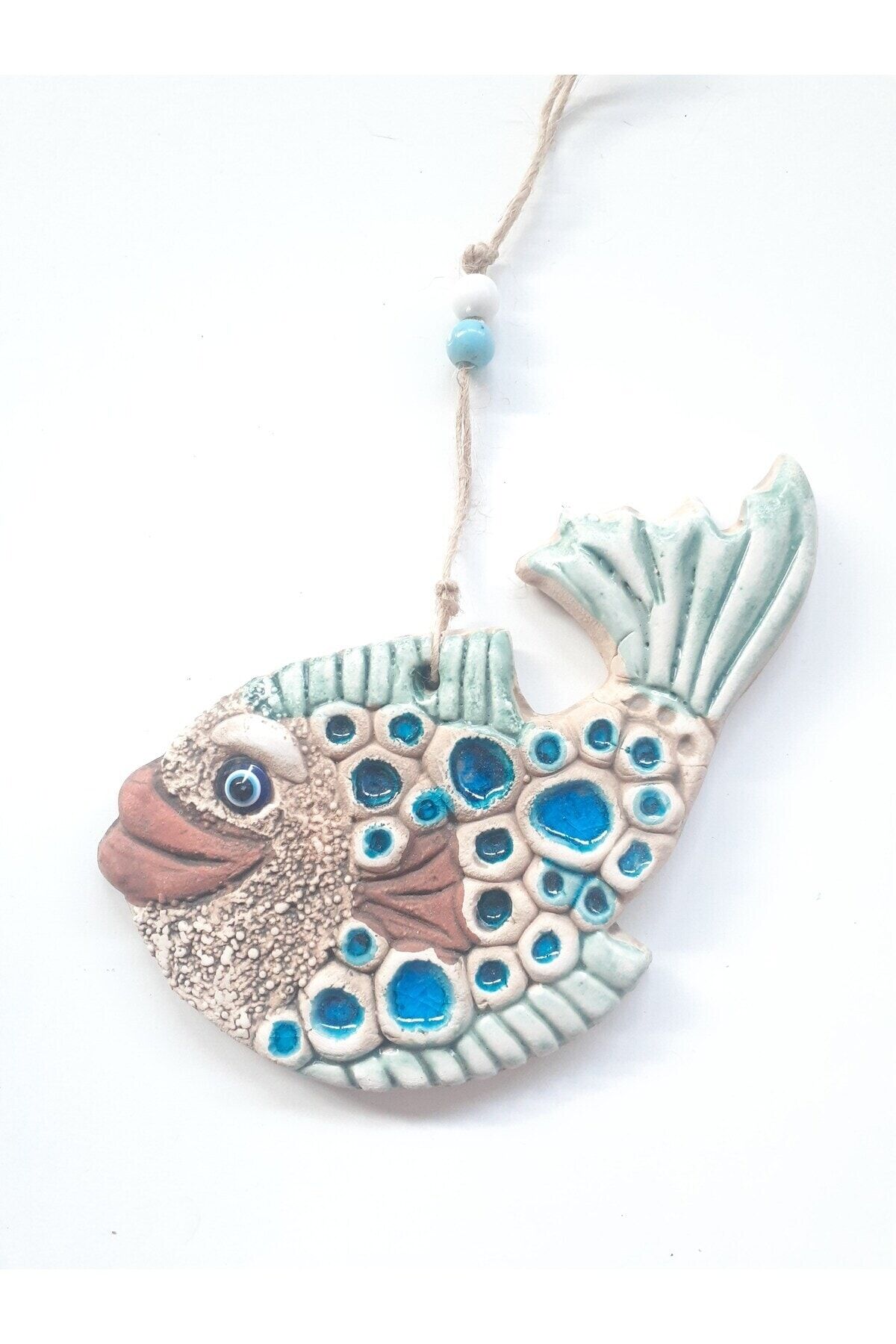 Tek parça halinde gelen bu duvar süsü, kolay montaj avantajı sunar ve ekstra parçalarla uğraşmanıza gerek kalmaz; Yüksek kaliteli seramik malzemeden üretilmiş olup, dayanıklılığı ve uzun ömürlü kullanımı garanti eder; Balık figürleriyle süslenmiş nazar boncuğu, bahçe, teras veya balkon gibi dış mekanlarda estetik bir görünüm sağlar;