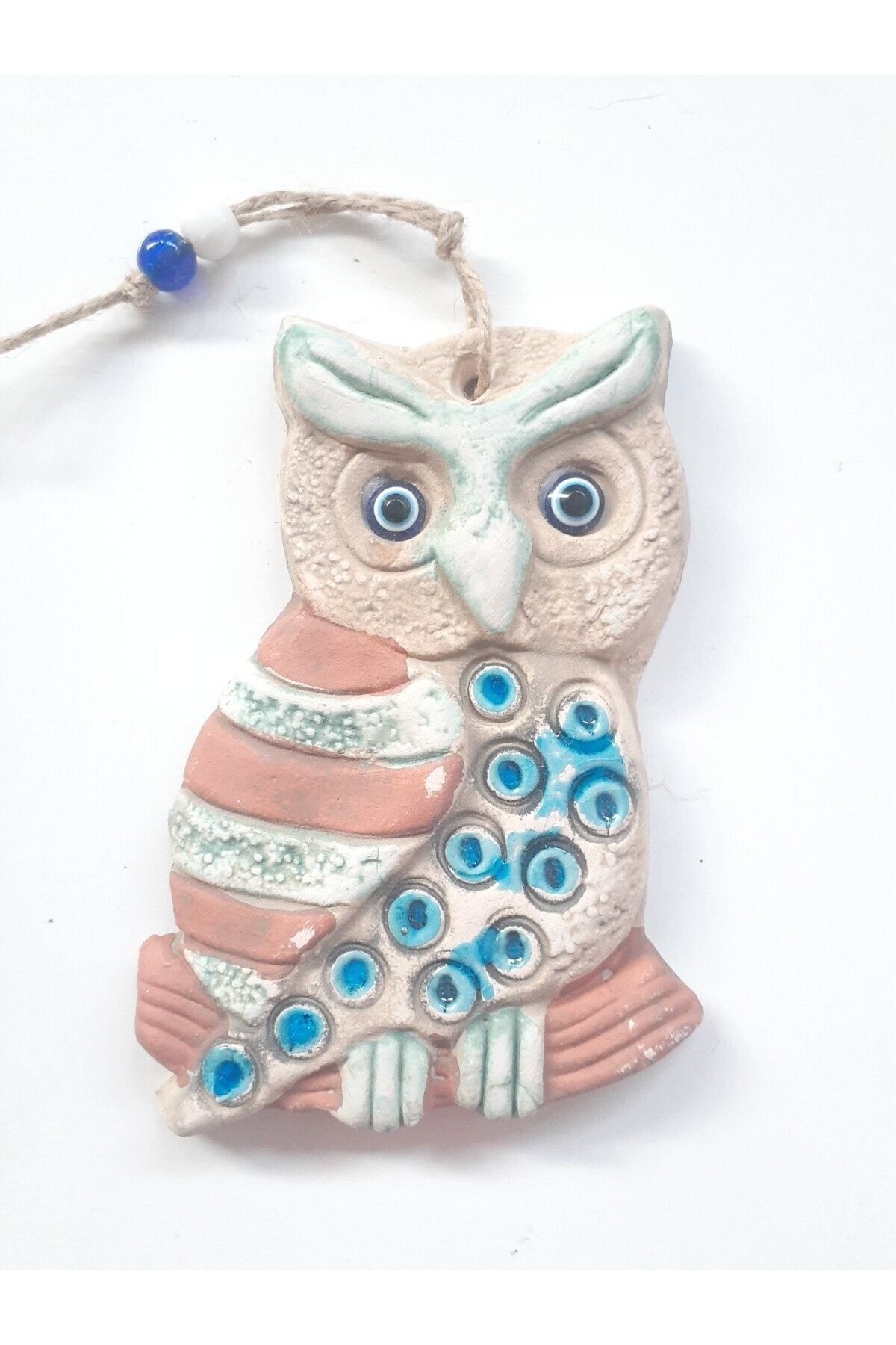 Seramik malzeme kullanılarak üretilmiş, dayanıklı ve uzun ömürlü bir duvar süsüdür; Tek parça halinde gelen bu ürün, kolay montaj imkanı sunar ve ekstra parçalarla uğraşmanıza gerek kalmaz; Baykuş figürleriyle süslenmiş nazar boncukları, estetik bir görünüm kazandırırken aynı zamanda bahçe, teras veya balkon gibi dış mekanlarda şıklık sağlar; Jüt ip detayları ile doğal bir dokunuş ekleyerek, mekanınıza sıcak ve samimi bir atmosfer katar;