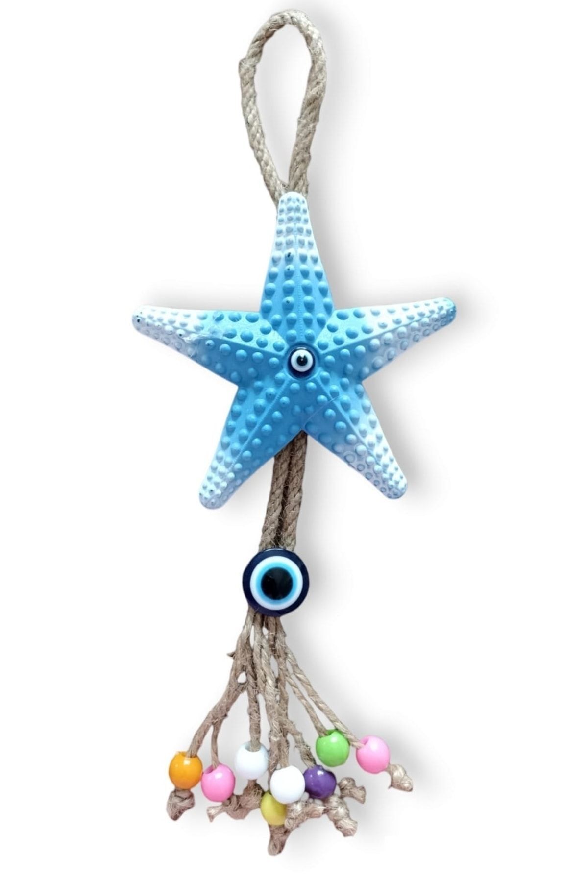 Mavi Deniz Yıldızı Figürlü Nazar Boncuklu Jüt Ipli Teras Bahçe Balkon Duvar Süsü Duvar Dekorasyon