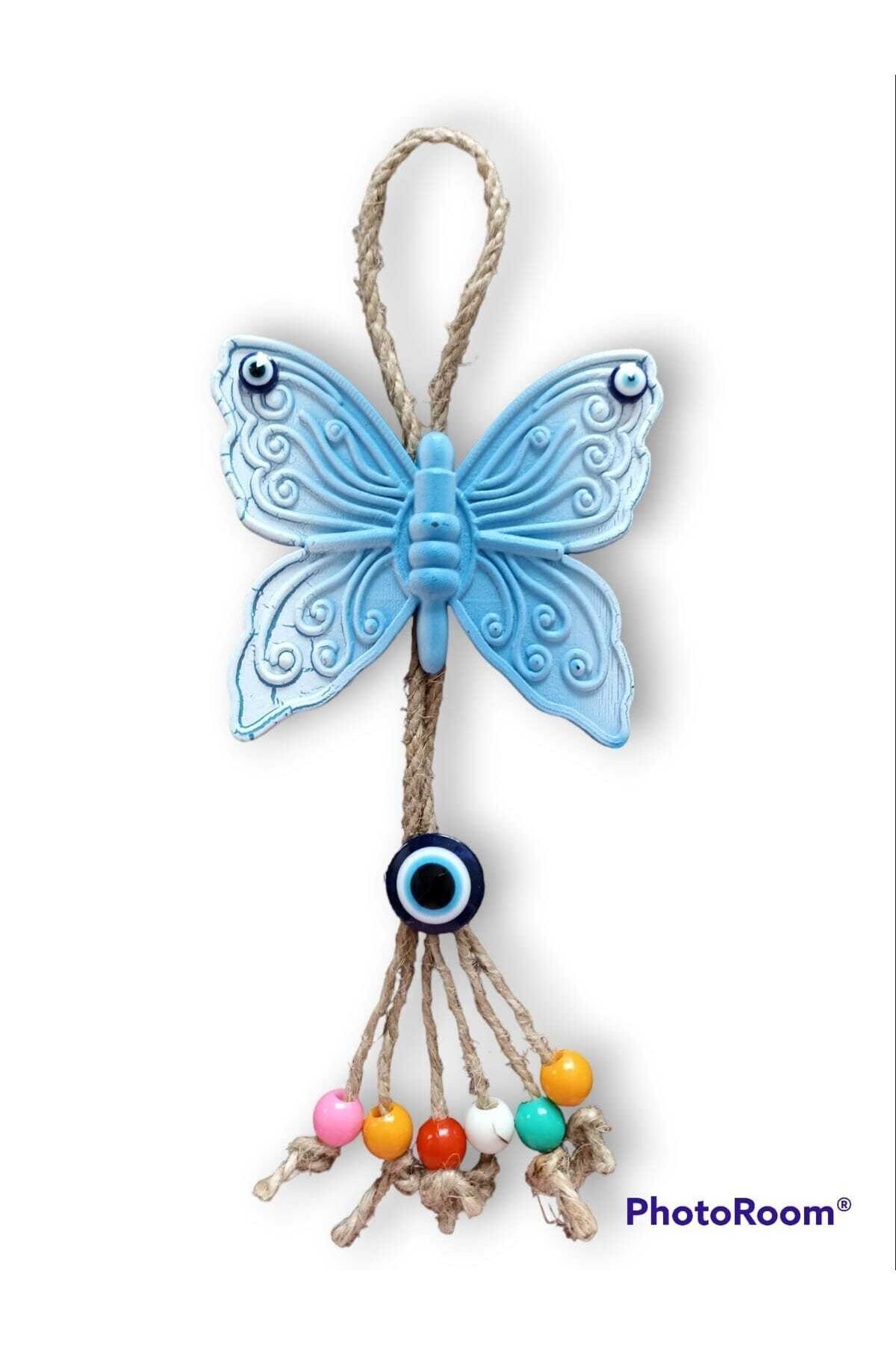 Mavi Kelebek Figürlü Nazar Boncuklu Jüt Ipli Teras Bahçe Balkon Yazlık Duvar Süsü Duvar Dekorasyon