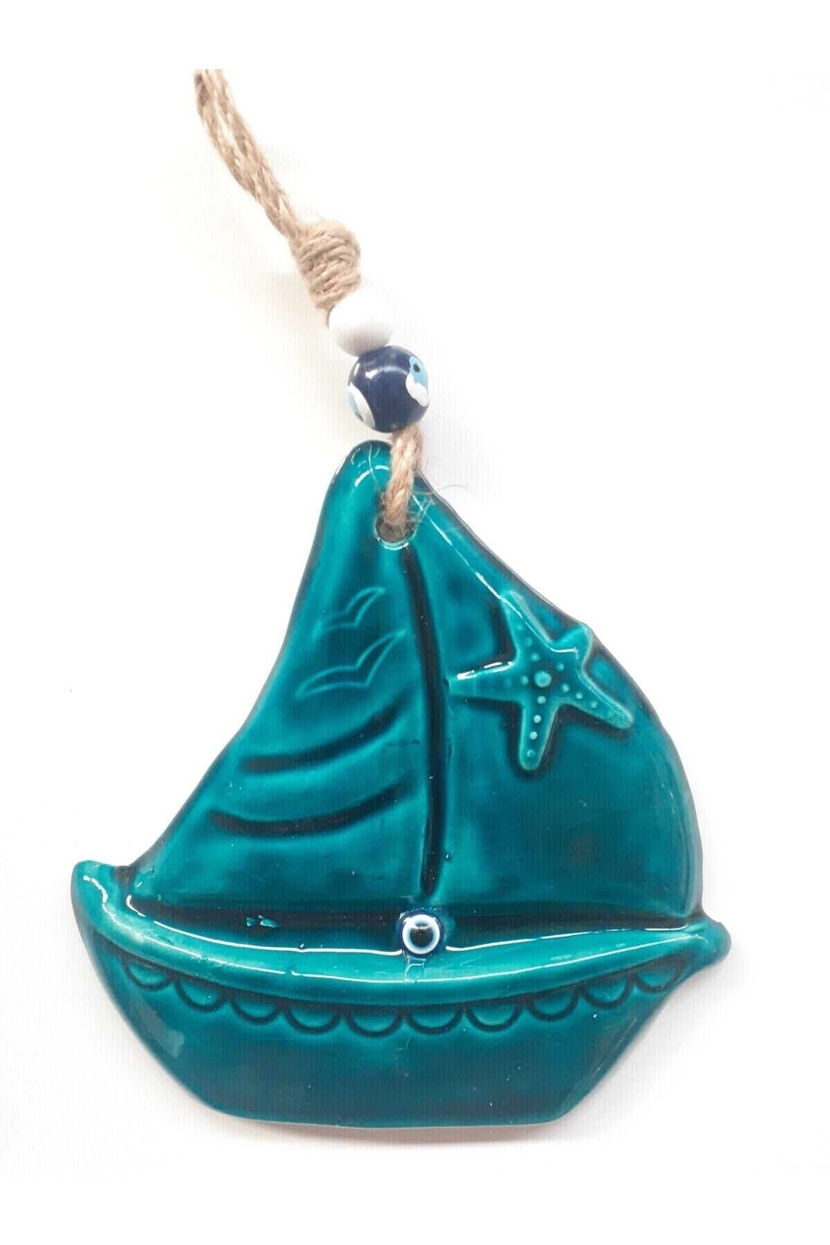 Turkuaz Gemi Yelken Figürlü Nazar Boncuklu Jüt Ipli Teras Bahçe Balkon Yazlık Duvar Süsü