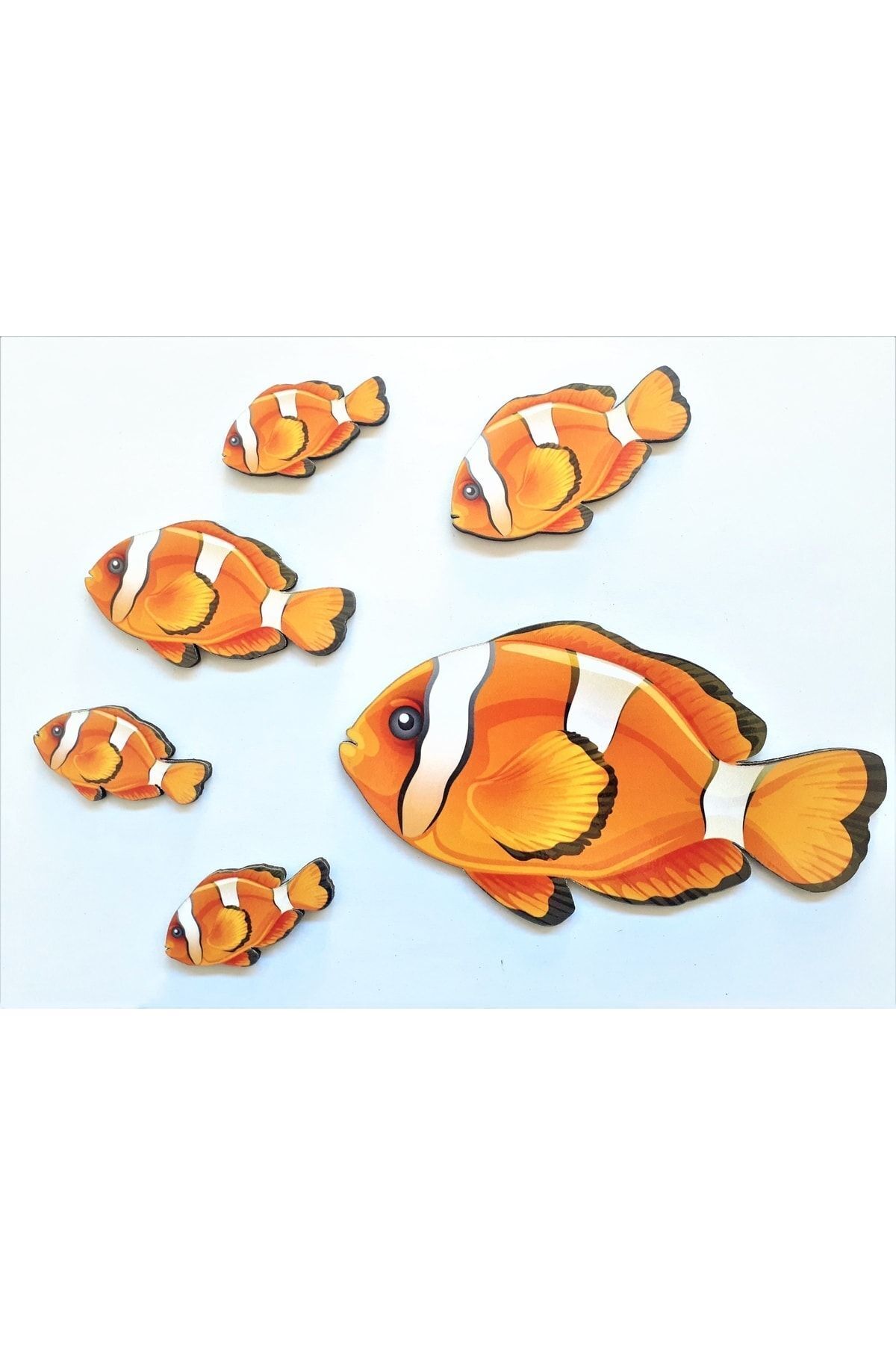 Balık figürleri 15x8.5 cm, 7.5x4 cm ve 5x2.5 cm ebatlarındadır.;Ürün içeriği 6 parçadır.;Arkaları çift taraflı bantlıdır.; 3 mm mdf kesim üzerindeki renkli kaplamalar solma ve kararma yapmaz.;Duvar, kapı ve dolap gibi yüzeylerde kullanılabilir.