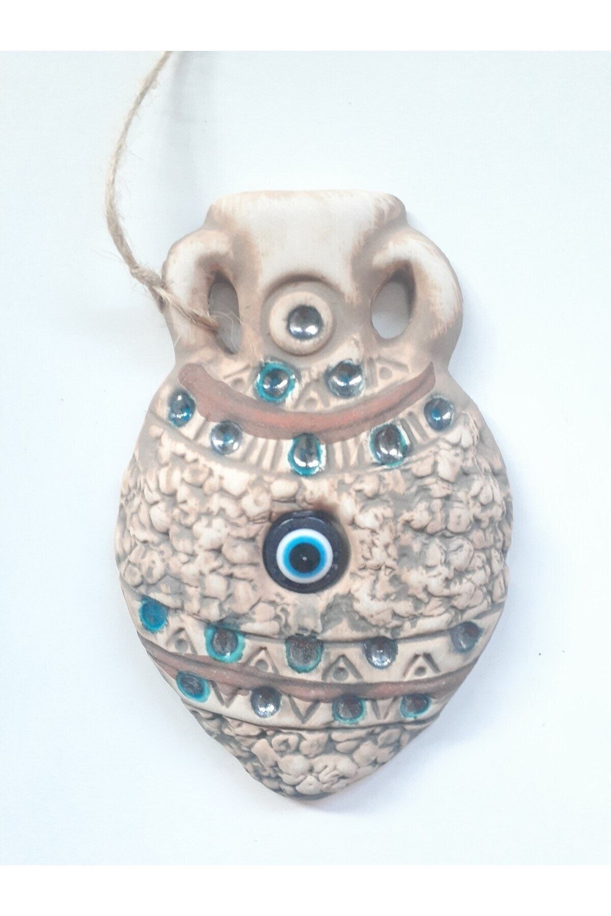 Seramik malzemesi sayesinde uzun ömürlü ve dayanıklı kullanım sunar; Tek parça halinde gelen bu ürün, kolay montaj imkanı sağlar ve ekstra parçalarla uğraşmanıza gerek kalmaz; Jüt ip detayları ile doğal bir dokunuş katarken, teras, bahçe ve balkon gibi dış mekanlarda estetik bir görünüm oluşturur; Yazlık ortamlar için ideal olan bu duvar süsü, nazar boncukları ile şans ve refahı simgeler;
